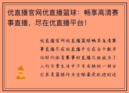 优直播官网优直播篮球:畅享高清赛事直播,尽在优直播平台! 在当今数字化时代,体育赛事的直播已经成为了人们日常生活中不可或缺的一部分。尤其是篮球作为全球最受欢迎的运动之一,吸引了无数球迷的关注。为了...