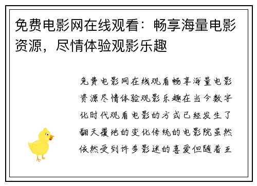 免费电影网在线观看:畅享海量电影资源,尽情体验观影乐趣 在当今数字化时代,观看电影的方式已经发生了翻天覆地的变化。传统的电影院虽然依然受到许多影迷的喜爱,但随着互联网的发展,越来越多的人选择在家中...